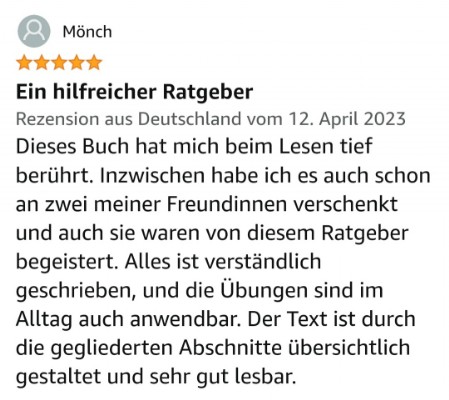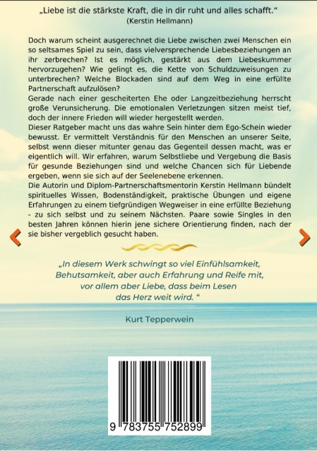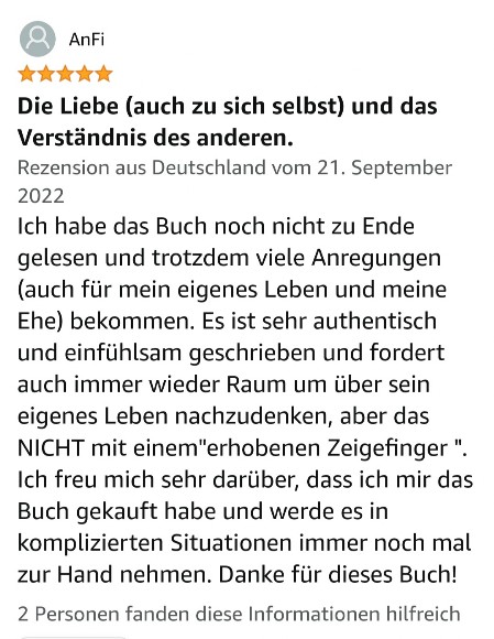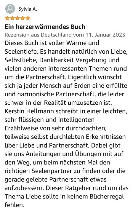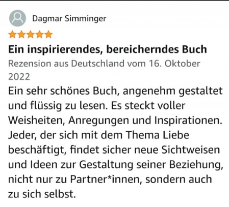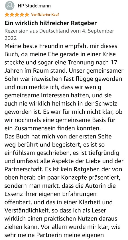 Später kamen dann andere Männer in mein Leben und ich wurde unerwartet auf den harten Boden von Beziehungsproblemen geworfen und musste lernen damit umzugehen. In dieser Zeit begann ich mich selbst zu reflektieren und begegnete dabei meinem Wegbereiter und Lehrer Kurt Tepperwein. Später absolvierte ich bei ihm meine Ausbildung als Partnerschafts-Mentorin und schrieb mein Wissen und meine Erkenntnisse in meiner Diplomarbeit nieder. Nachdem Kurt Tepperwein diese Arbeit gelesen hatte, schrieb er mir einen Brief, in dem er meine Arbeit als außergewöhnliches Werk hervorhob. Er empfahl mir daraus ein Buch entstehen zu lassen. Von da ab hat es weitere sechs Jahre gebraucht, um noch an einigen Herausforderungen zu wachsen und all meine Erkenntnisse auf den neuesten Stand zu bringen. Nun ist das Werk vollbracht und ich darf Dir mein erstes Buch ans Herz legen.